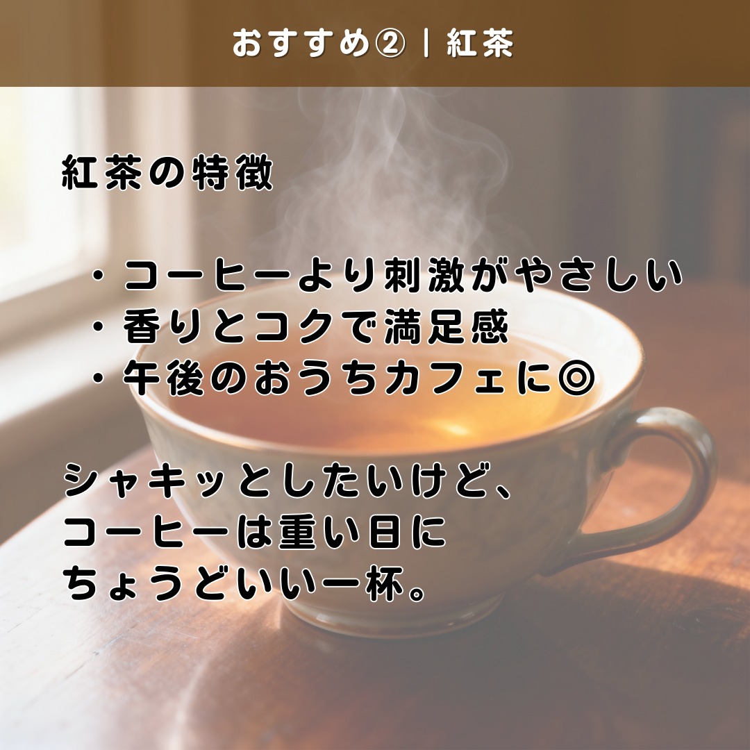 紅茶はコーヒーより刺激がやさしく、香りとコクで満足感があります。