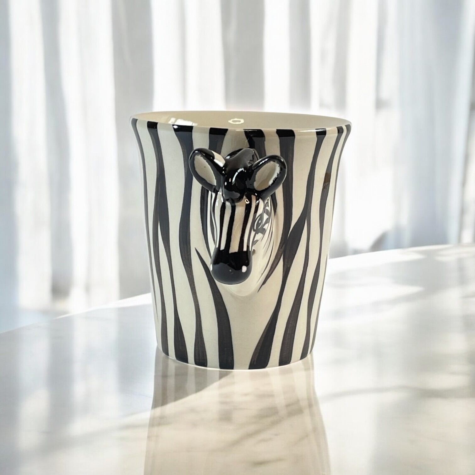 個性的なシマウマ柄が目を惹く、ユニークデザインの陶器コップ。