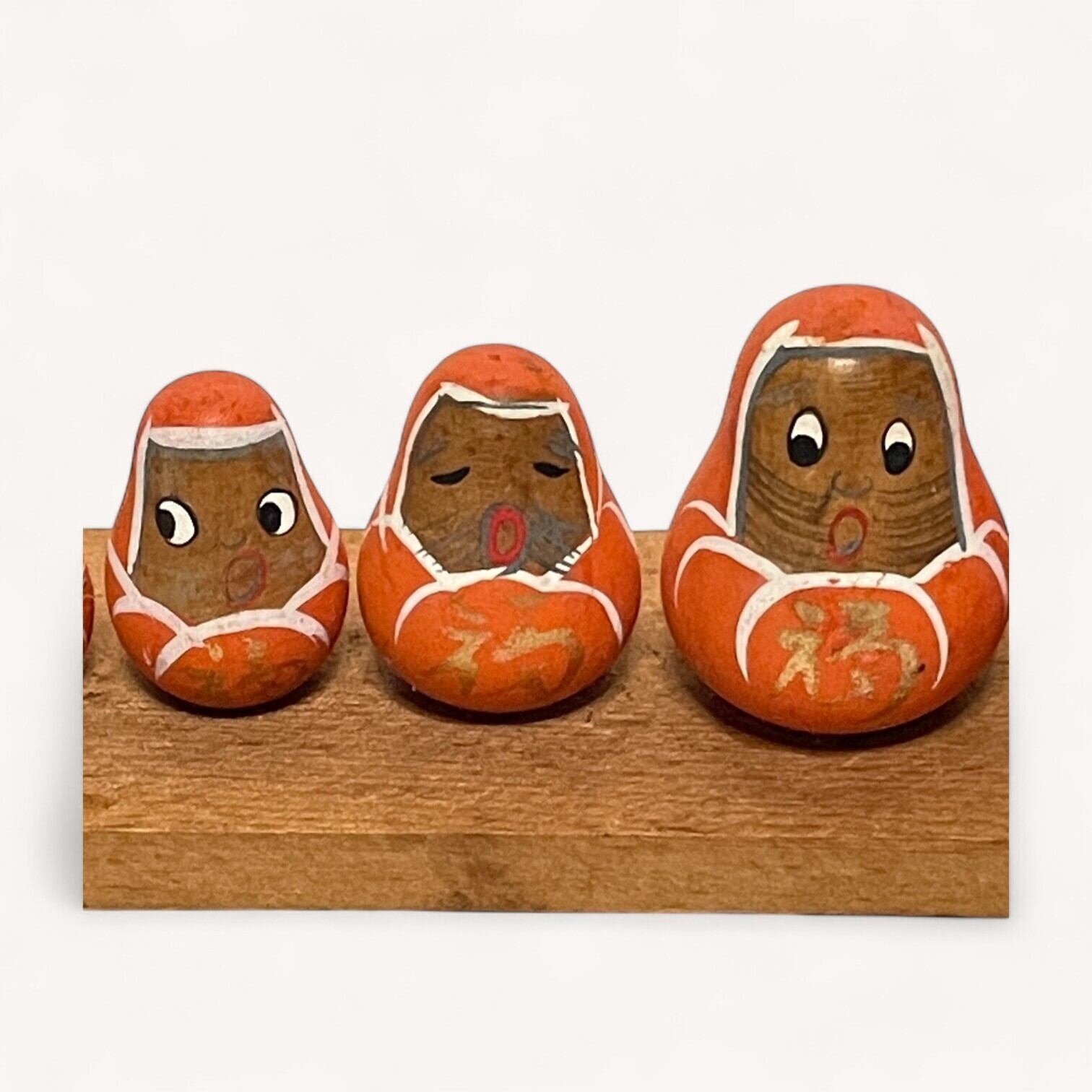 縁起の良い8体のだるまが並ぶ、昭和レトロな木製置物セット。