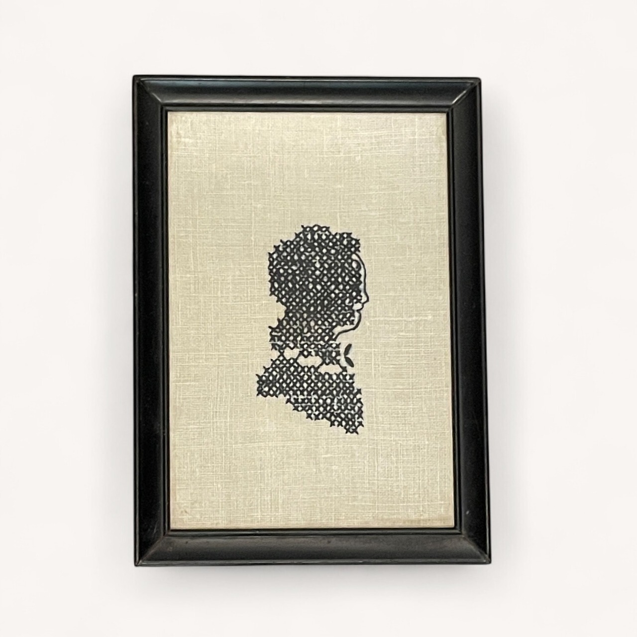 白と黒の糸で丁寧に刺繍された、男の子の横顔を描いたクロスステッチアート。