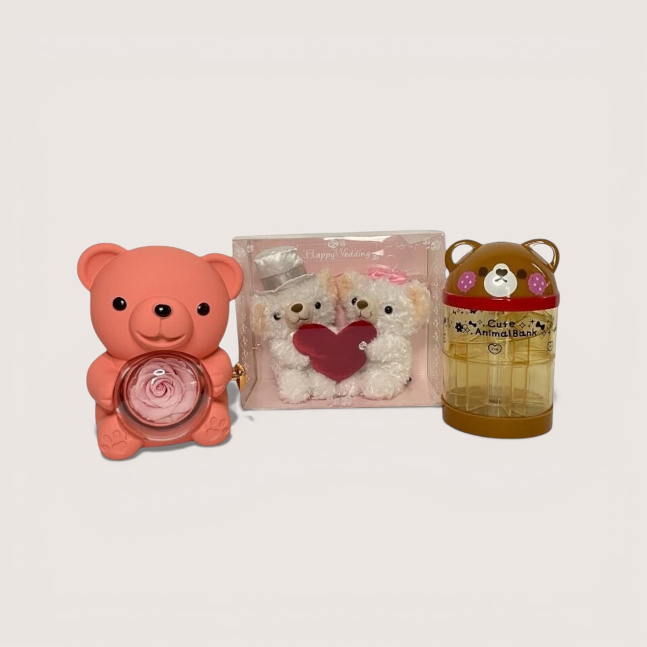 ぬいぐるみ・置物・貯金箱と、それぞれ表情の違うくまたちが並びます♡