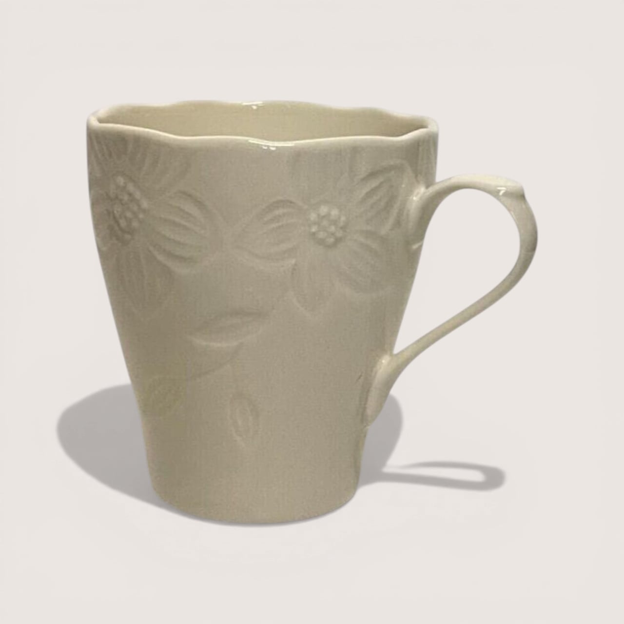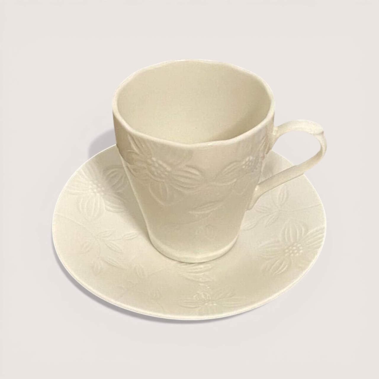 シンプルなホワイトに上品な花模様が映え、ティータイムを特別な時間に。